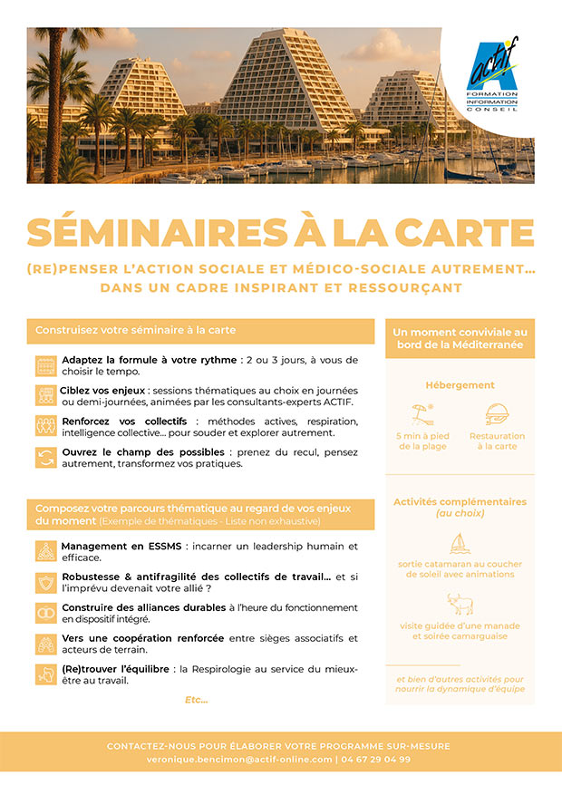 - Ciblez vos enjeux : sessions thématiques au choix en journées ou demi-journées, animées par les consultants-experts